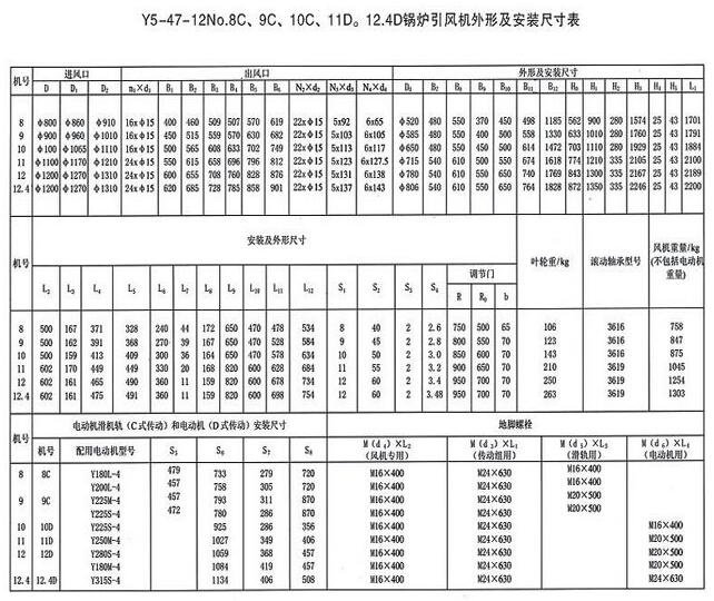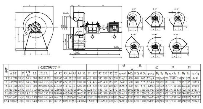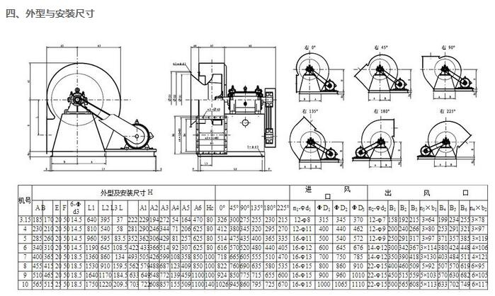 1)引风机制成单吸入,机号有№3.15、4、5、6、7、8、9、10、11、12、12.4十一种。