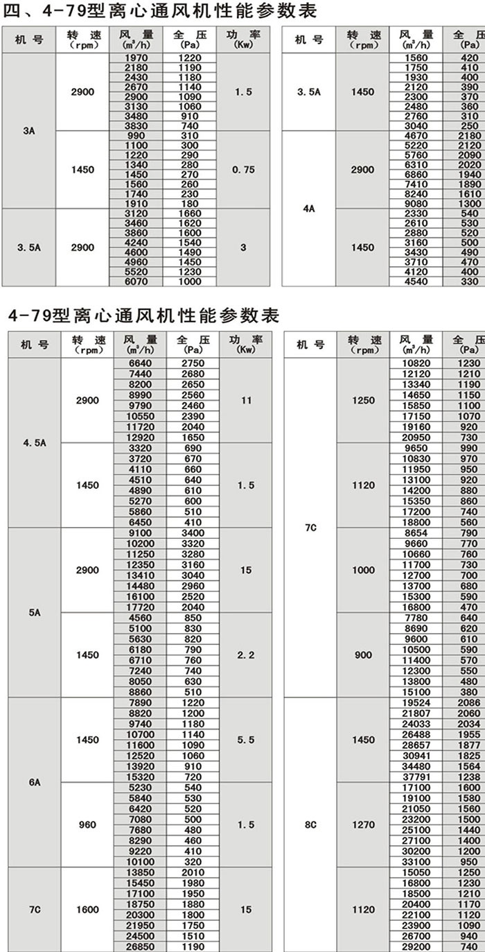 4-79离心通风机的空气性能良好、效率高、噪声低,它主要用于一般工厂及大型建筑物的室内通风换气,即可用作输出气体。输入的气体,也可用作输出气体。输送的气体应为空气和其它不自燃的、对人体无害的、对钢铁材料无腐蚀性的气体,气体不许含粘性物质,所含的灰尘及硬质颗粒物不大于150mg/m。 3ο,气体的温度不得超过80。C